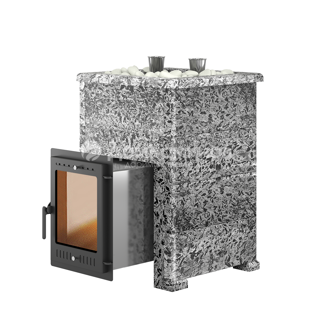 Конструкция печи включает в себя закрытую каменку из нержавейки марки AISI-430 толщиной 4 мм, расположенную в верхней части топки. Каменка размещена прямо на пути пламени и дымовых газов, что позволяет нагреть камни до температур свыше 600°C.