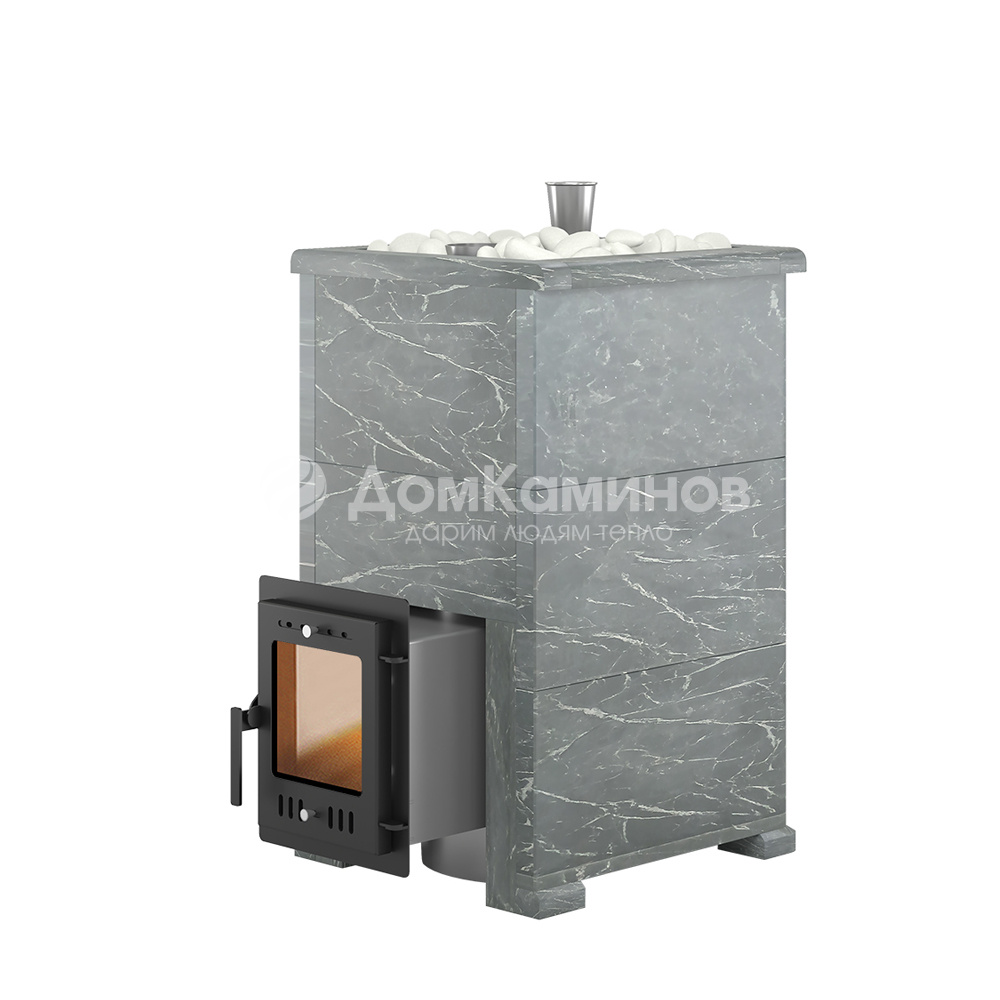 Конструкция печи включает в себя закрытую каменку из нержавейки марки AISI-430 толщиной 4 мм, расположенную в верхней части топки. Каменка размещена прямо на пути пламени и дымовых газов, что позволяет нагреть камни до температур свыше 600°C.