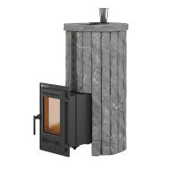 Закрытая каменка печи изготовлена из нержавеющей стали марки AISI 430 толщиной 4 мм. Каменка размещается прямо на пути пламени и горящих газов, что позволяет нагревать камни со всех сторон и быстро достигать температуры 450-500°C. Форма каменки обеспечивает максимальное снятие энергии с горящих в топке дров. Объём топки рассчитан на размещение 50-60 кг камней для бани. Для подачи воды в каменку предусмотрены 2 заливные воронки, направляющие воду в нижний и средний ярус заклада каменки. Это позволяет легче управлять паром и получать пар разной степени насыщенности. Облицовка сделана из отдельных планок или полос натурального талькохлорита, которые называются ламелями.