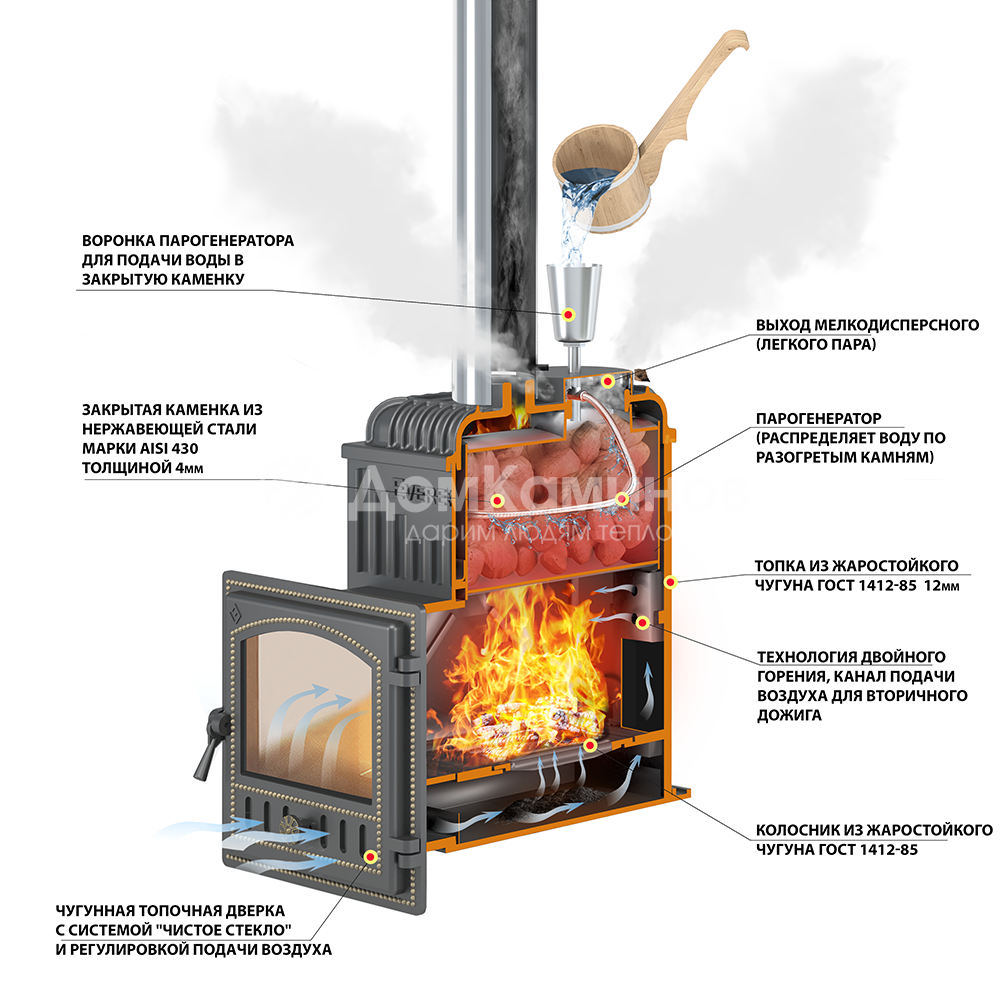 Топка банной печи «Эверест Лёгкий Пар» изготовлена из высококачественного жаростойкого чугуна. На месте пламегасителя в верхней части топки размещена закрытая каменка из нержавеющей стали толщиной 3 миллиметра. Объём каменки рассчитан на 25-30 килограммов камней.