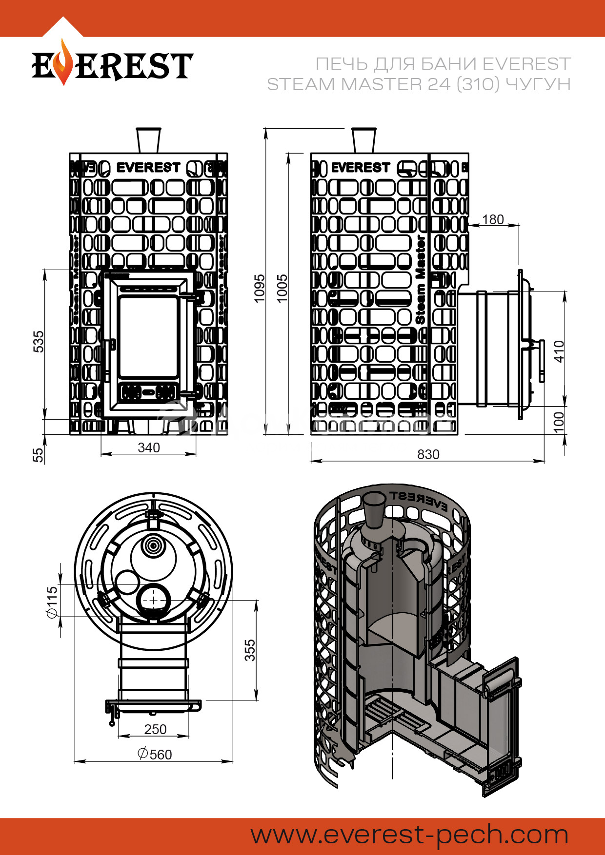 Верхняя часть топки изготовлена из чугунных колец. В печи Эверест "Steam Master" 24 (310) ЧУГУН между топкой и крышкой размещено одно кольцо высотой 120 миллиметров.