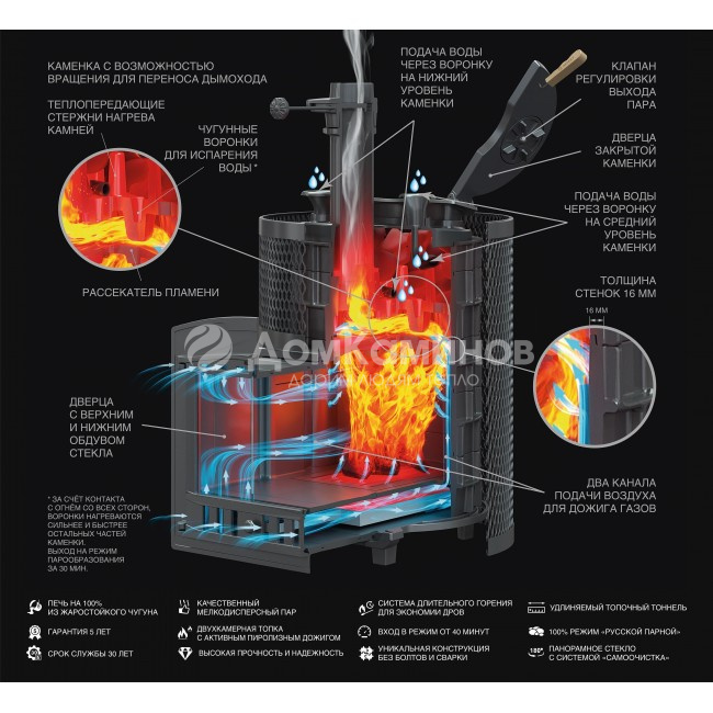 Масса пароиспарителя в печи Аванград 24– 42 кг, и он нагревается прямым контактом с пламенем. У пароиспарителя 2 поверхности с увеличенной рабочей площадью – снизу идёт нагрев огнём, а сверху поддаётся вода для пара. Для увеличения площади испарения и нагрева первых слоёв камней на каменке отлиты высокие шипы.