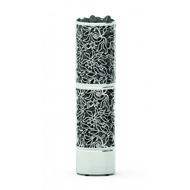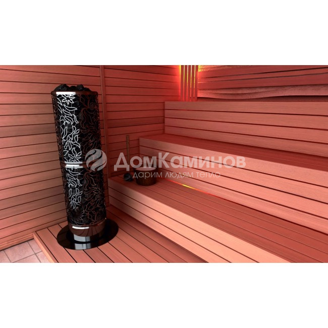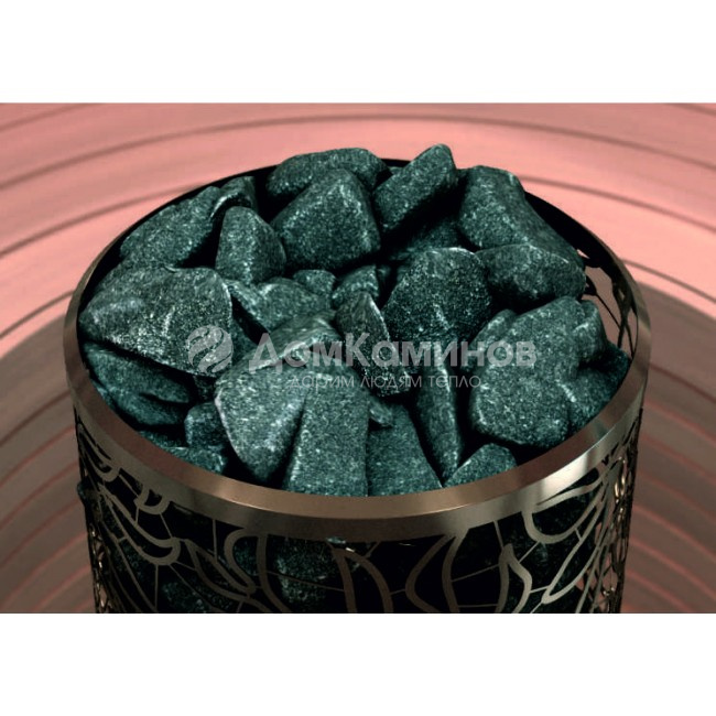 Кожух печи сделан из высококачественной нержавеющей стали и имеет декоративное оформление. Продуманная конструкция позволяет размещать вокруг печи достаточно большое количество камней. Такое решение позволяет воспроизводить достаточно много пара и при этом печь не занимает лишнего места в парной. Башенная конструкция способствует равномерному прогреву воздуха в парилке и хорошо аккумулирует тепло.
