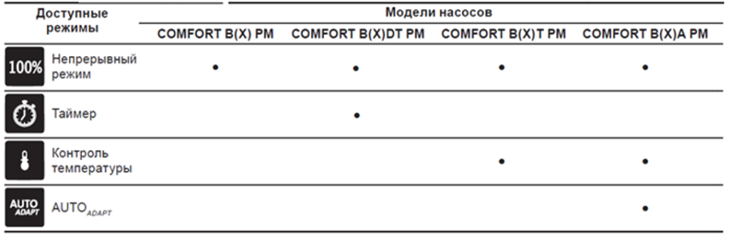 Режимы работы в насосах COMFORT