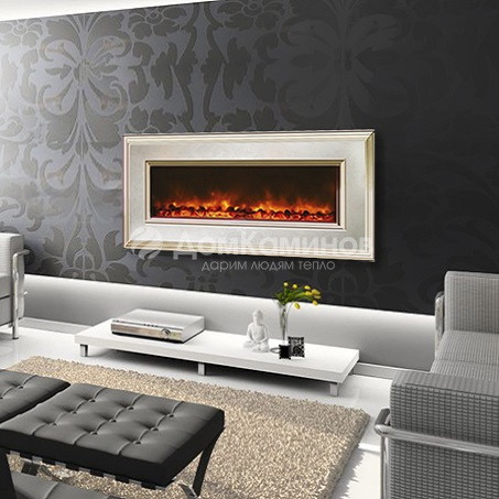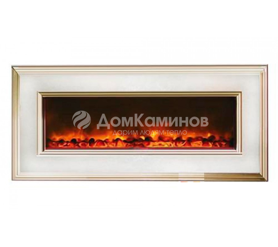 Рамка камина - белый багет с золочением. Яркий эффект горения пламени, яркость пламени регулируется с пульта ДУ. Современный дизайн. Пульт ДУ в комплекте. Мощность многоступенчатая обогрева 1000-2000 Вт. В декоративном режиме потребляемая мощность - 80 Вт.