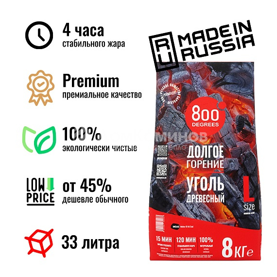 Продукция сертифицирована и производится из отходов лесопереработки, а также засохших деревьев из Карелии, Алтая и Сибири. Производство древесного угля 800 Degrees не наносит ущерба экологии, а готовая продукция отличается от аналогов низкой зольностью, высокой теплоотдачей, отсутствием запаха и длительным ровным горением. Кусковой уголь отлично подходит для копчения и режимов low-n-slow.