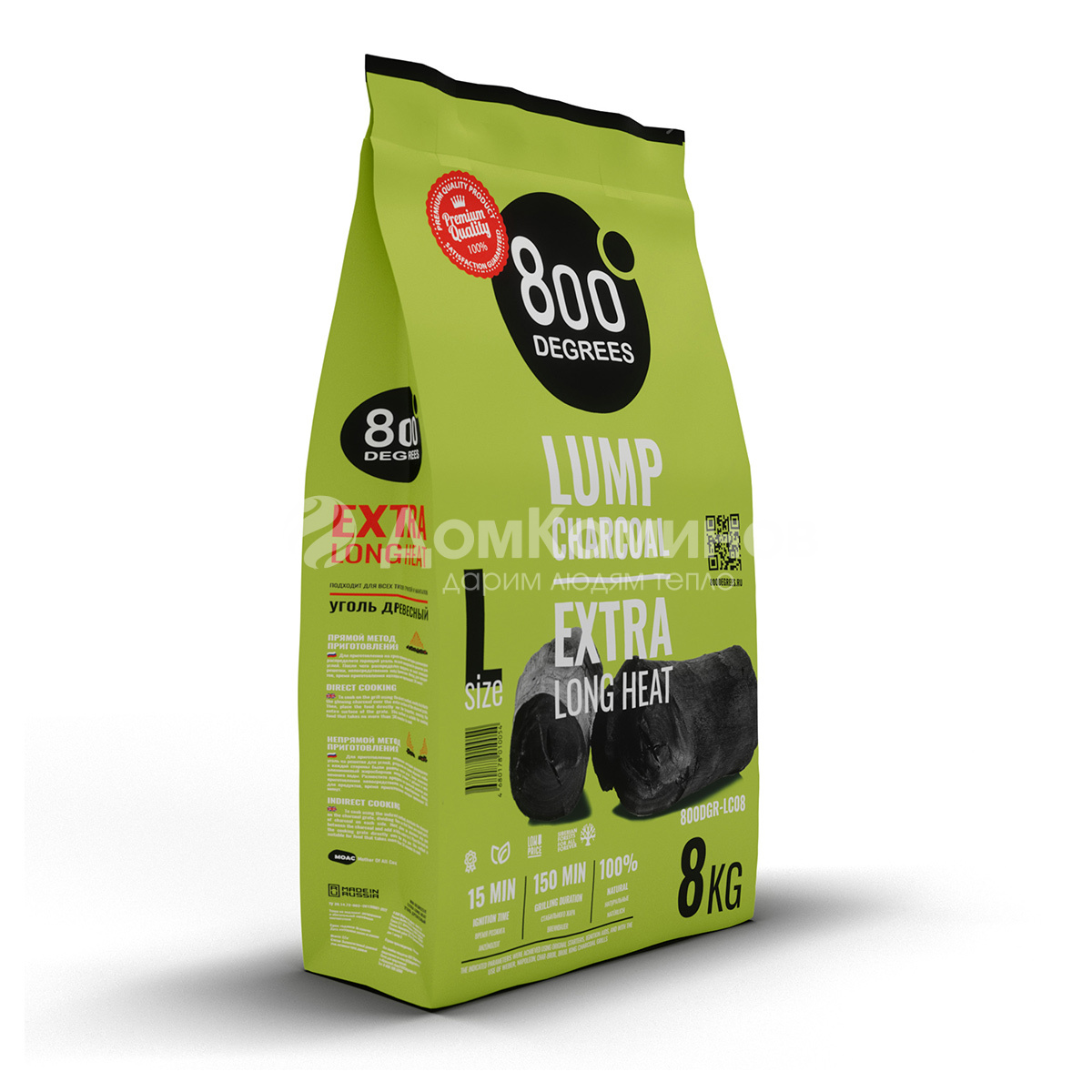 Уголь кусковой древесный 800 Degrees Extra Long Heat в многослойных, плотных бумажных мешках с удобной ручкой для переноски. Производятся по нашей собственной технологии и рецептуре из плодовых и лиственных пород деревьев. Вся продукция рекомендована для приготовления пищи Русским Обществом Барбекю (РОБ) к применению во всех типах угольных и дровяных грилей, хосперах, а также в мангалах, печах и очагах.
