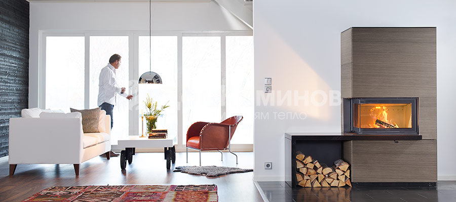 Великолепный камин с угловой дверцей облицован песчаником - натуральным долговечным камнем глубокого орехового цвета. Камин может быть оборудован теплонакопительным блоком, аккумулирующим дополнительное тепло.