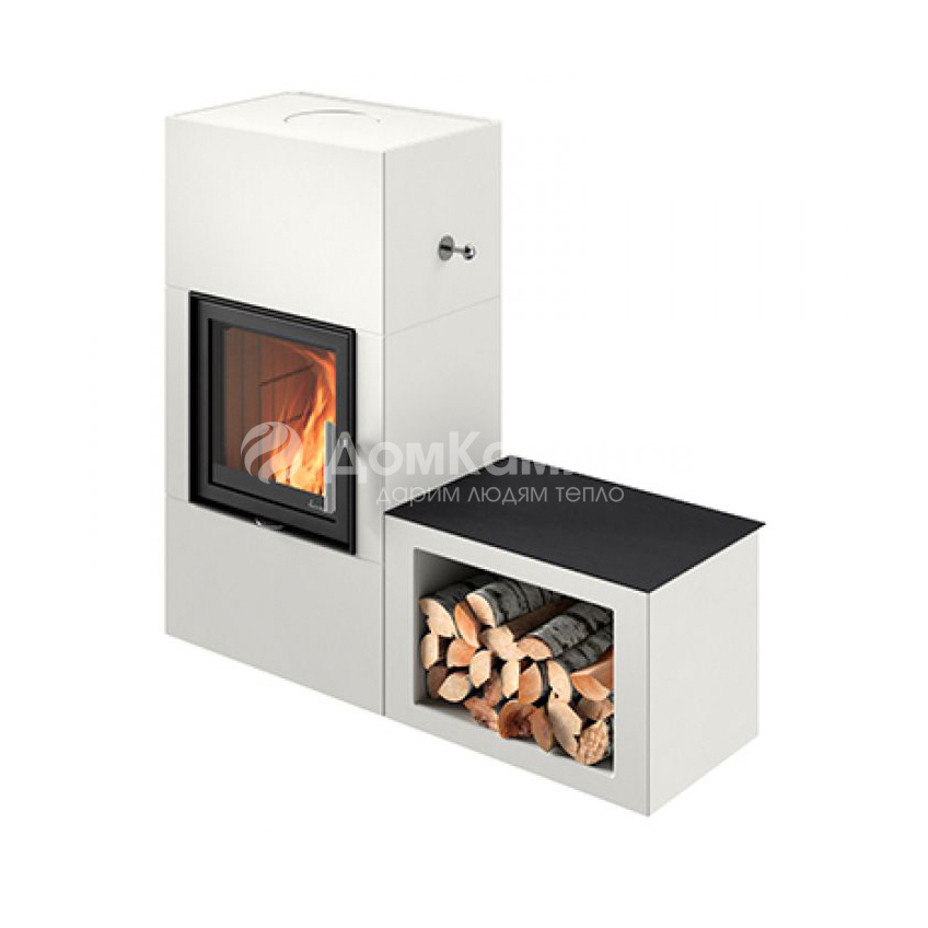 По теплоаккумулирующим характеристикам камин превосходит знаменитый талькохлорит и способен излучать тепло после розжига в течение 12 часов. Топка выполнена из стали и облицована белоснежным огнеупорным кирпичом, который не теряет свой цвет во время работы камина. Принцип действия - двойной дожиг топлива, когда для полного сжигания дерева используется горячий вторичный воздух.
