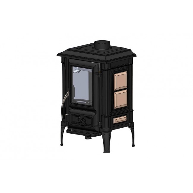 Печь предназначена для обогрева закрытого помещения. Тепло передается через огнеупорное стекло и через литые части печи. Детали печи изготовлены из чугуна, на дверце топки расположено огнеупорное стекло. Печь оборудована первичным и вторичным регуляторами воздуха, которые регулируют количество воздуха необходимого для горения. Первичный регулятор воздуха должен быть полностью открыт на протяжении всего времени розжига (15-20 минут). Во время работы печи, при достижении стабильного режима горения, с целью экономии топлива, первичный регулятор закрывается. Вторичный регулятор позволяет содержать стекло в чистоте и улучшает процесс горения.