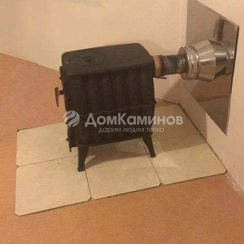 Для печи весом 106 кг не нужно стоить фундамент. Достаточно положить под дно лист из жаропрочной стали или огнеупорную плиту, что помимо защиты от возгорания позволяет распределить вес конструкции по полу и снизить нагрузку на перекрытия. Серьезную подготовительную работу придется проделать, только если в доме тонкий деревянный пол на лагах с большим шагом. В этом случае лучше разобрать участок, где будет стоять печь, и усилить основание.