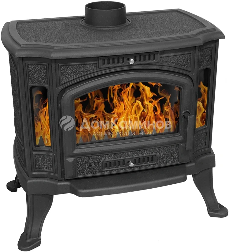 Печь-камин Везувий KZ-14 выполнен из жаростойкого чугуна и, обладая мощностью 14 кВт, способен обогреть помещение до 250 м3. Устройство комплектуется чугунной дверкой с большим панорамным стеклом и стеклянными вставками с двух сторон. Корпус печи выполнен в цвете Антрацит.