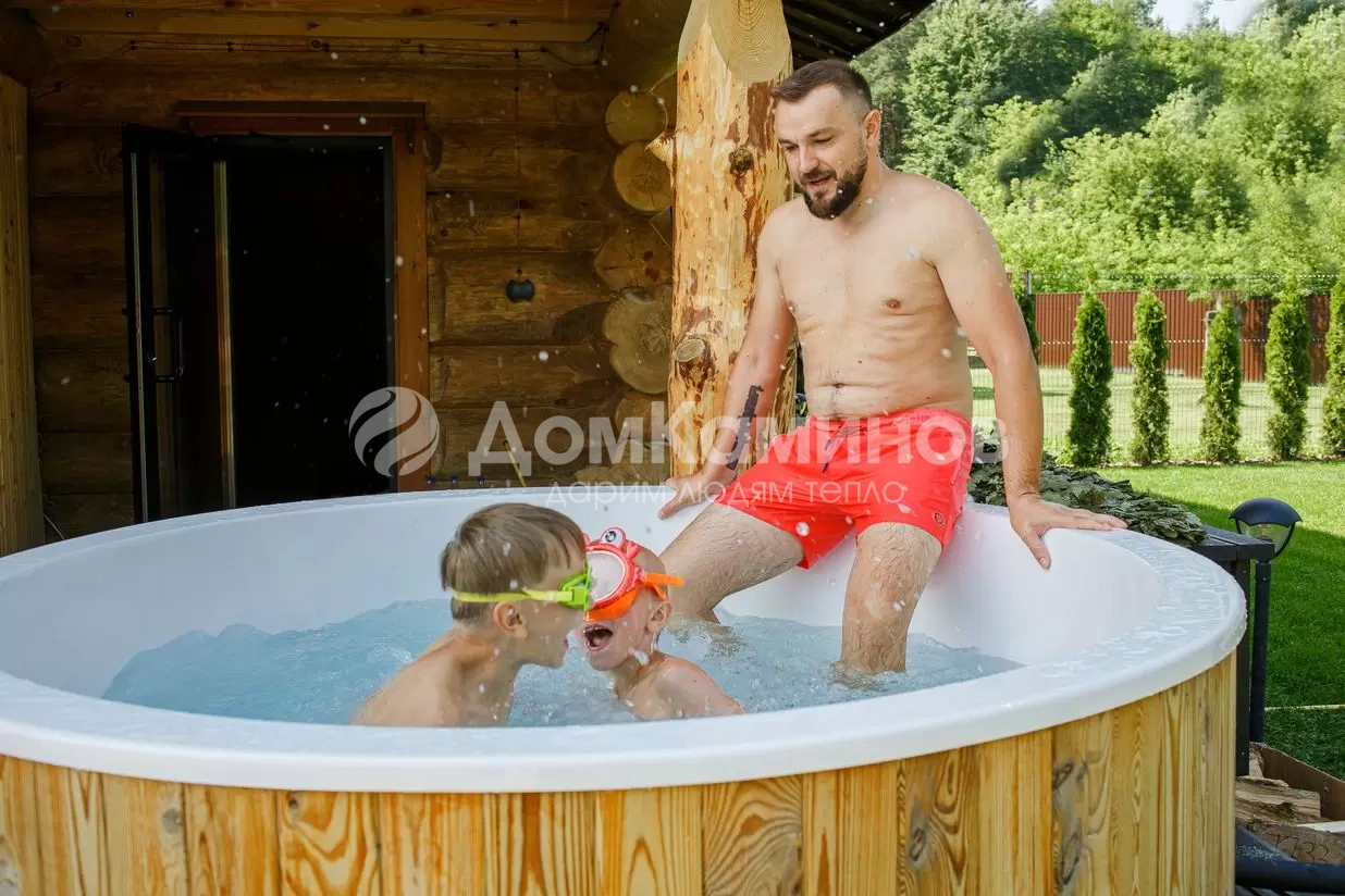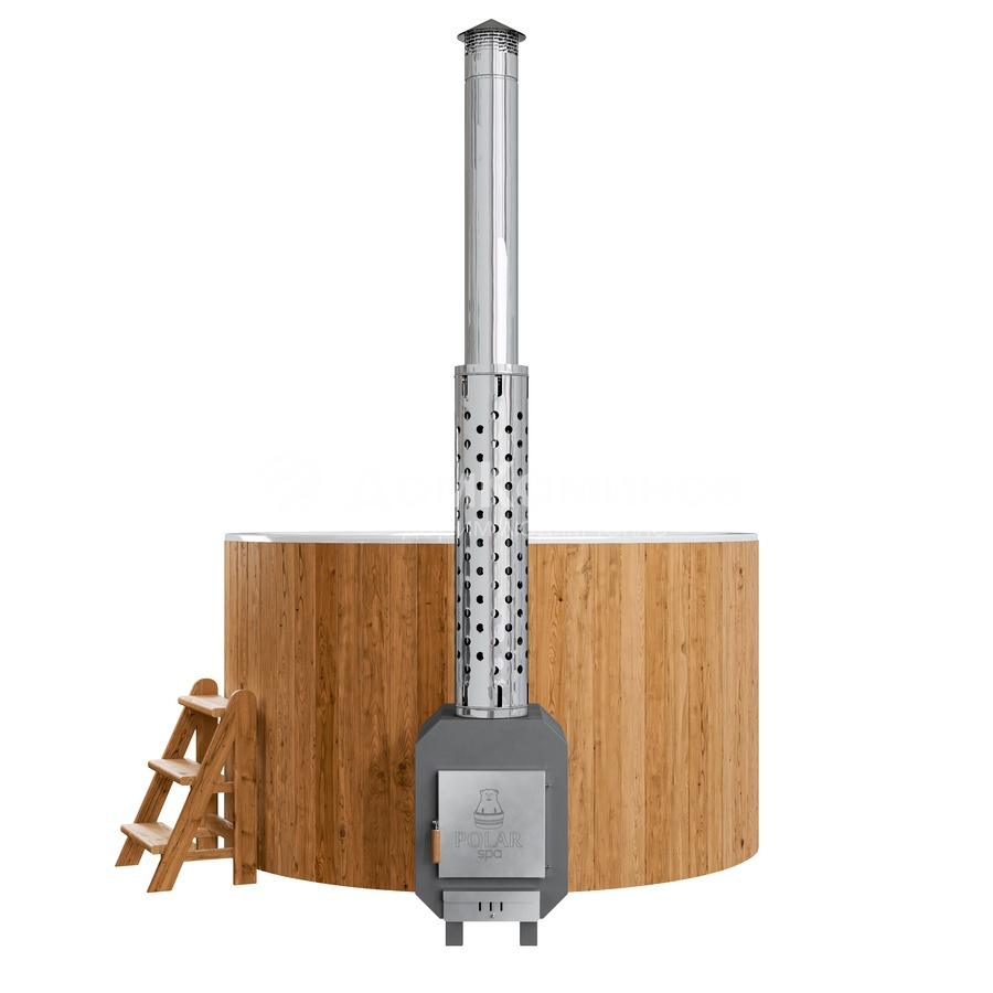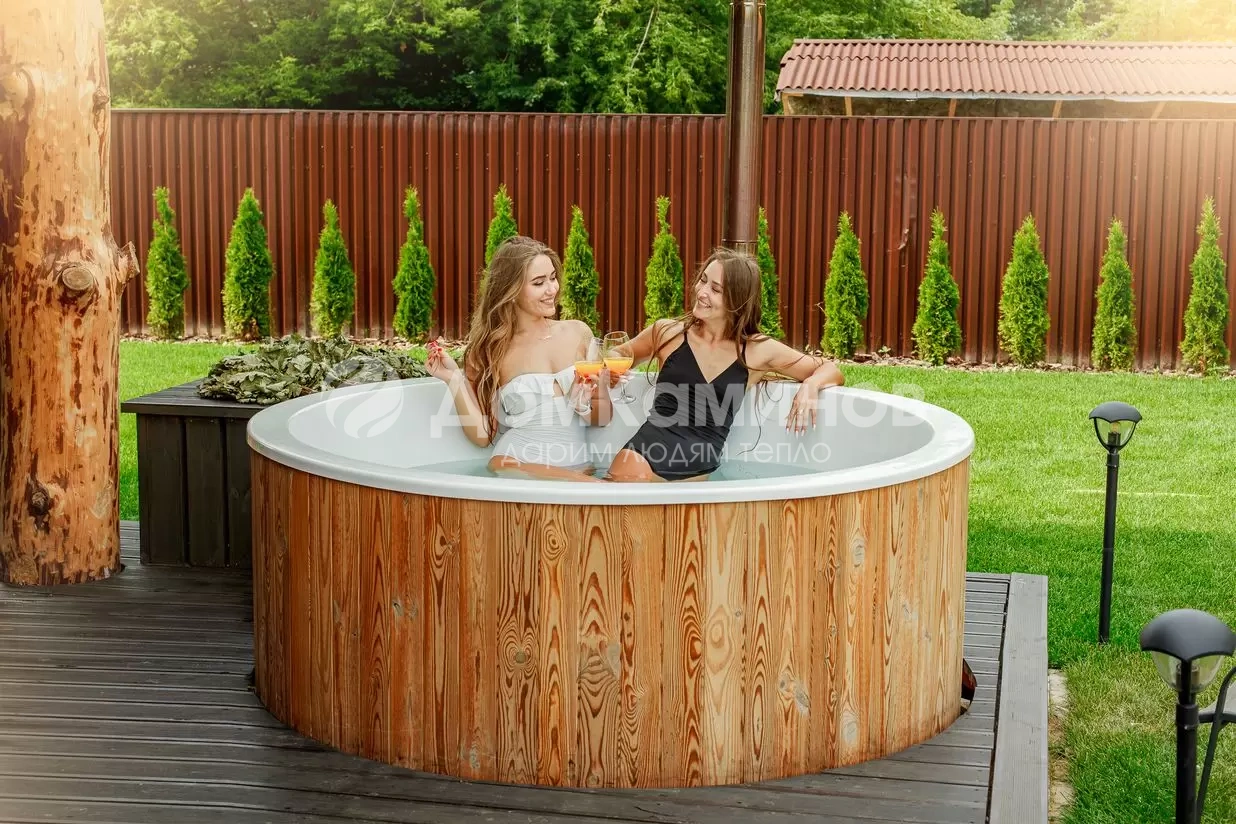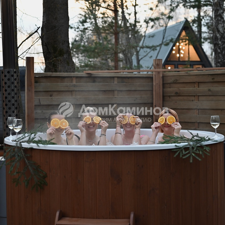 Внешняя печь мощностью 40кВт нагреет воду до комфортной температуры за 1,5-2 часа.Остается зажечь свечи, добавить в воду масло лаванды, включить приятную музыку и наслаждаться релаксом.