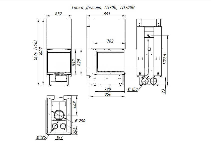 Топки ДЕЛЬТА это сплав наших знаний о современных Европейских тенденциях в области создания каминных топок и требований отечественного покупателя к удобству эксплуатации, внешнему виду и надежности камина. Наши топки принесут в ваш дом атмосферу комфорта, и отлично впишутся в любой интерьер. Мы производим каминные топки из высококачественной котельной стали и наносим термостойкое лакокрасочное покрытие с антикоррозийными свойствами. Топки серии ДЕЛЬТА имеют следующие конструктивные особенности: Топочная камера футерована современным материалом, литьевым шамотом бежевого или черного цвета (по желанию покупателя) и надежно защищает металлические детали корпуса топки от перегрева. Жаропочное стекло из Японии способно выдерживать температуру до 750 С. Система тепловой разводки имеет два встроенных патрубка диаметром 125 мм для подключения системы распределения теплого воздуха в смежные помещения и позволяет увеличить площадь обогреваемых помещений. Система забора воздуха извне, имеет два встроенных патрубка диаметром 125 мм для подключения забора воздуха на горение из соседнего помещения, улицы, подвала, и повышает надежность работы топки. Система очистки стекла эффективно очищает жаропрочное стекло и позволяет любоваться красотой огня. Система вторичного дожега увеличивает КПД топки и позволяет экономить дрова. Встроенная шиберная заслонка позволяет увеличивать/уменьшать сечение дымового канала и регулирует мощность топки. Ребра жесткости по всему корпусу топки и встроенные в дымосборник тепловые каналы позволяют снимать больше тепла и отдавать его в помещение путем конвекции. Высокий дымосборник и пламярассекатель не позволяют дымовым газам попадать в помещение при открывании дверцы. Бесшумная и надежная тросовая система с противовесом и жаропрочными подшипниками, позволяет открывать дверцу топки вверх и производить закладку дров в топочную камеру. Для оптимизации процессов горения все регулировки подачи воздуха на систему первичное горение, систему очистки стекла и встроенную шиберную заслонку производятся специальным ключом «ХОЛОДНАЯ РУКА». Под чугунной колосниковой решеткой в днище топки, находится большой зольный ящик, который удобно вынимается. Устойчивые, регулируемые по высоте ножки, позволяют при монтаже установить топку по уровню.