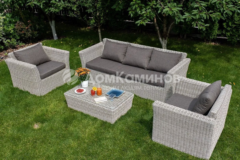 Кресла и диван идут в комплекте с подушками с серыми чехлами. Они пошиты из качественного полиэстера с плотностью 230гр/м2. Материал предварительно проходит обработку влагоотталкивающей пропиткой. Столик дополнен практичной столешницей из стекла толщиной 5 мм.