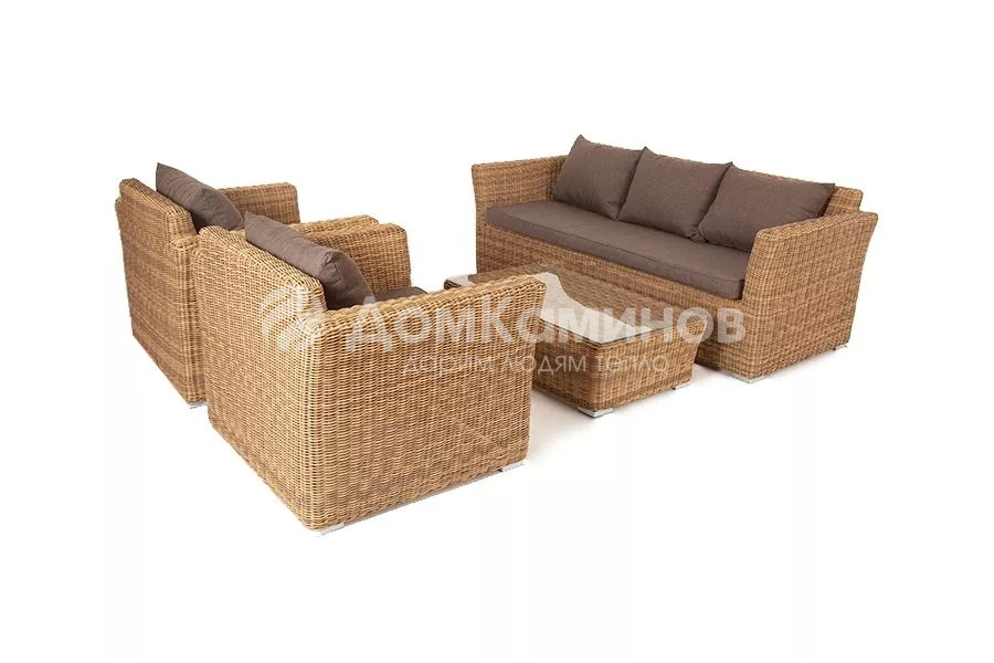 Лаунж зона на 5 персон. В комплект входит один трехместный диван, два кресла, журнальный столик и подушки.
