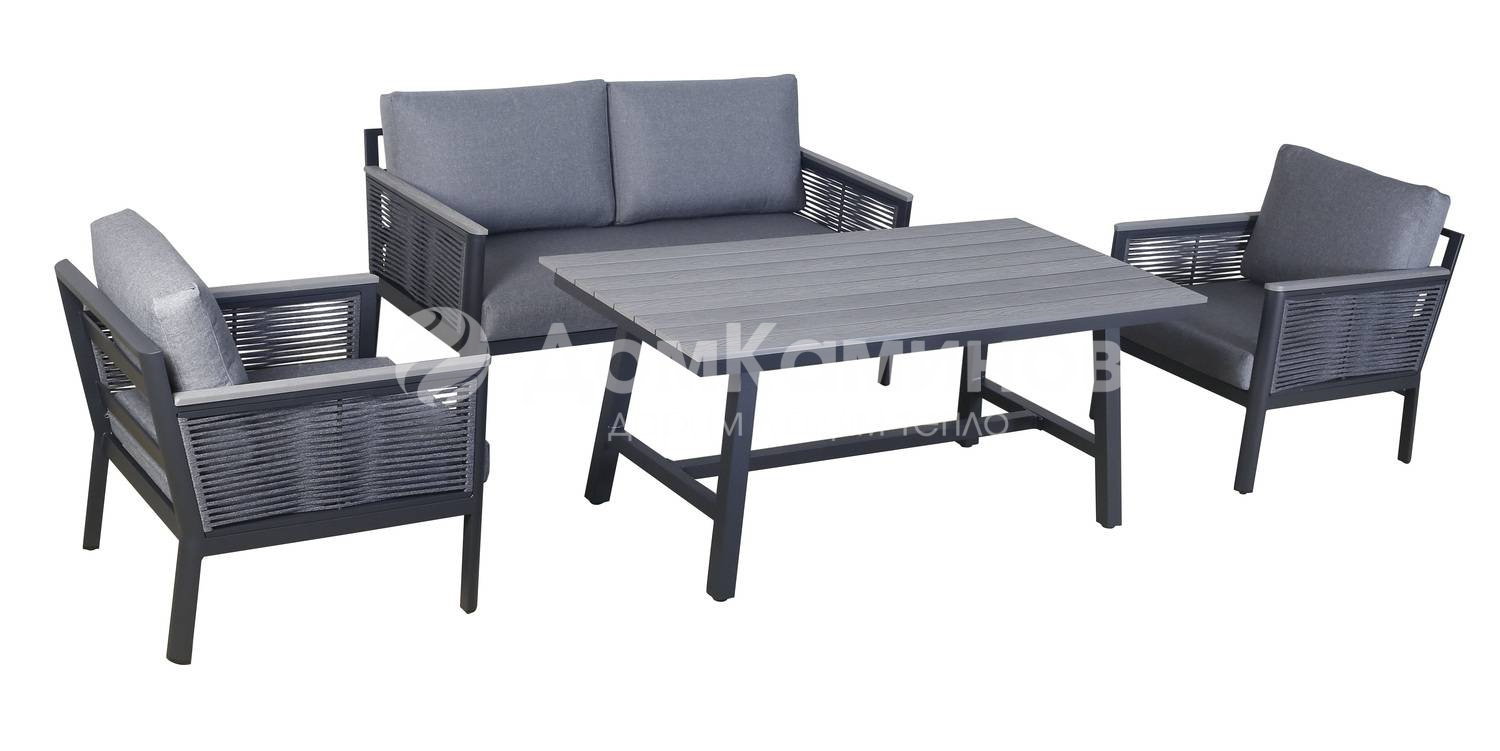 Диван и кресла оснащены подушками серого цвета со съёмными чехлами. Стол со столешницей из ДПК.