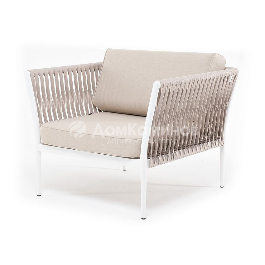 Плетеное кресло "Касабланка" с подушками в комплекте.Кресло имеет алюминиевый каркас, окрашенный порошковой краской в белый цвет. Боковины каркаса вручную оплетены роупом - эластичными синтетическими лентами, изготовленными из высокопрочных полиэфирных волокон. Цвет оплетки - бежевый.Подушки со съемными чехлами, которые обработаны влагоотталивающей пропиткой. Материал - 100% полиэстер, плотностью 230гр/м2.