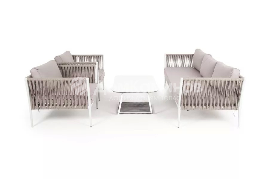 Лаунж-зона «Касабланка» расчитана на размещение 5-х персон.Состоит из:- трехместного дивана - 2150×800×695 мм.- двух кресел - 900×800×695 мм каждое.- журнального столика - 900×600×420 мм.Диван и кресла изготовлены их алюминиевого прочного каркаса, оплетенного ручным способом роупом бежевого цвета. Это эластичные ленты из полиэфирных волокон высокого качества.Каркас окрашен в белый цвет износостойкой порошковой краской.Журнальный столик также имеет алюминиевый каркас белого цвета. Столешница выполнена из монолитного компакт-пластика HPL молочного оттенка. Нижняя часть столика задекорирована роупом серого цвета и представляет дополнительную полку для хранения.