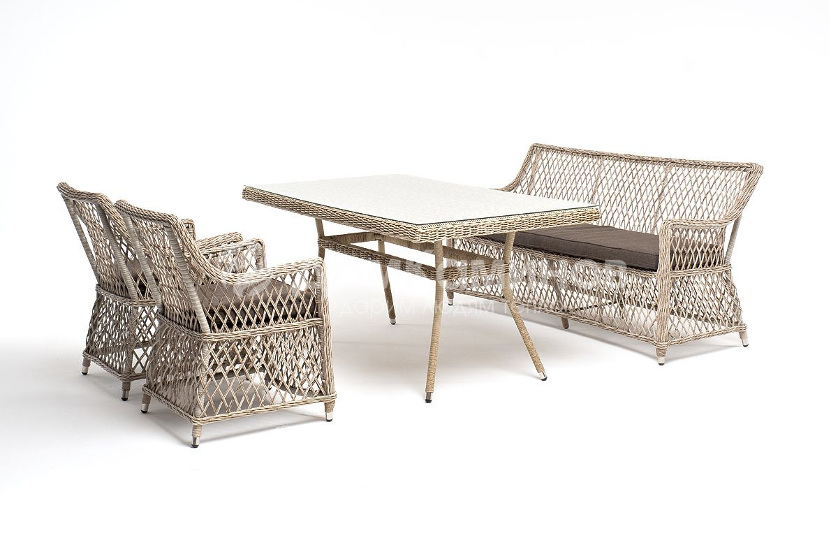 Все предметы мебели изготовлены из прочного алюминия, вручную оплетенного долговечным искусственным ротангом. На креслах и диване предусмотрены подушки со съемными чехлами и влагостойкой пропиткой. Стол укомплектован прочным стеклом толщиной 5 мм для удобства использования.