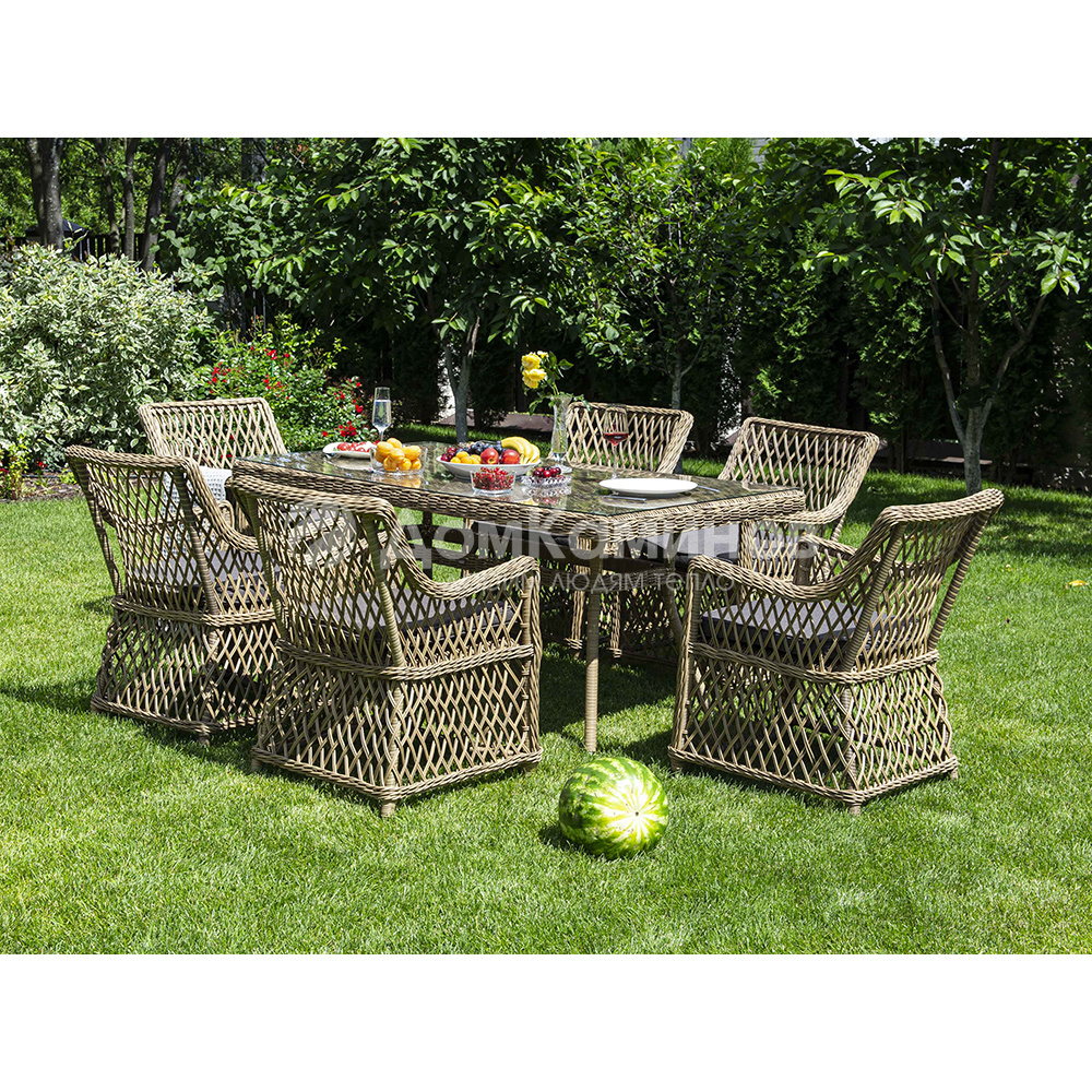 Обеденный комплект "Латте" в графитовом оттенке выполнен из искусственного ротанга и алюминиевого каркаса.Состоит из прямоугольного стола со стеклянной столешницей, размером 1600х900х750 мм и 6 кресел, размером - 680х550х840 мм.Кресла предполагают подушки со съемными влагоотталкивающими чехлами в комплекте.