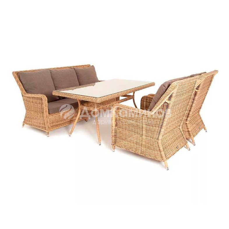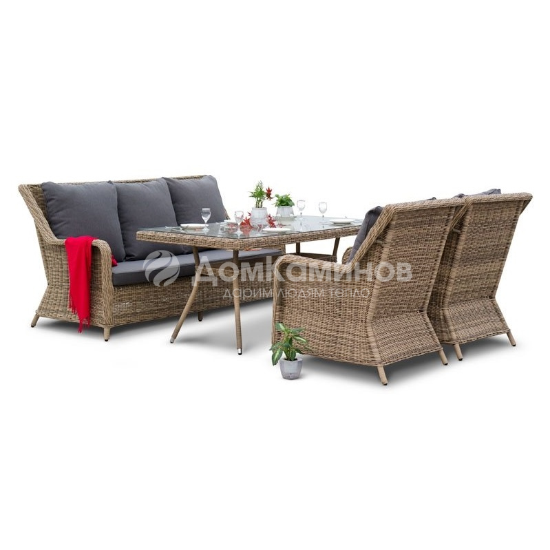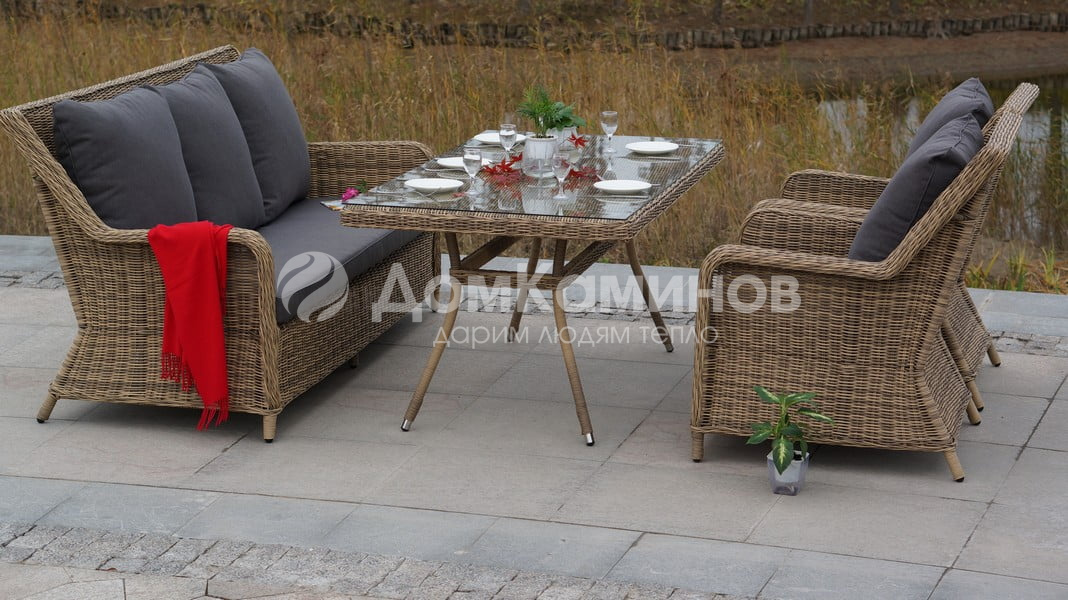 Каркас мебели алюминиевый. Он оформлен с помощью искусственного ротанга круглой формы и был оплетен ручным способом. Цвет плетение - соломенный.