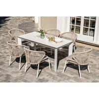Обеденная группа «Венето» предназначена для комфортного размещения 6 персон и станет отличным дополнением к вашей территории для проведения трапезы с друзьями или семьей. Комплект из стола «Венето» и 6 стульев «Милан» выполнен в едином стиле, комбинируя качественные материалы и современный дизайн.Стол «Венето» оснащен столешницей из надежного HPL-пластика, который обладает высокими показателями стойкости к истиранию, ударам, высоким температурам и влаге, обеспечивая долговечность использования. Габариты столешницы 1600×800 мм. Цвет столешницы - «молочный», что позволяет легко вписать его в любой интерьер. Высота стола 75 см, что соответствует стандарту для обеденной мебели.Стулья «Милан» выполнены из роупа бежевого цвета, который гармонируют с общим дизайном комплекта. Размер каждого стула составляет 570×620×795 мм. Каркас из алюминия придает стульям легкость и прочность, а порошковое окрашивание защищает металл от коррозии и увеличивает срок службы мебели.