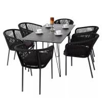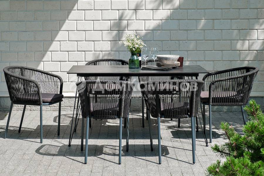 Каркас стульев - алюминиевый, оплетен вручную современным материалом - роупом. Это эластичные синтетические ленты из высокопрочных полиэфирных волокон. В комплект входят подушки со съемными водоотталкивающими чехлами серого цвета.