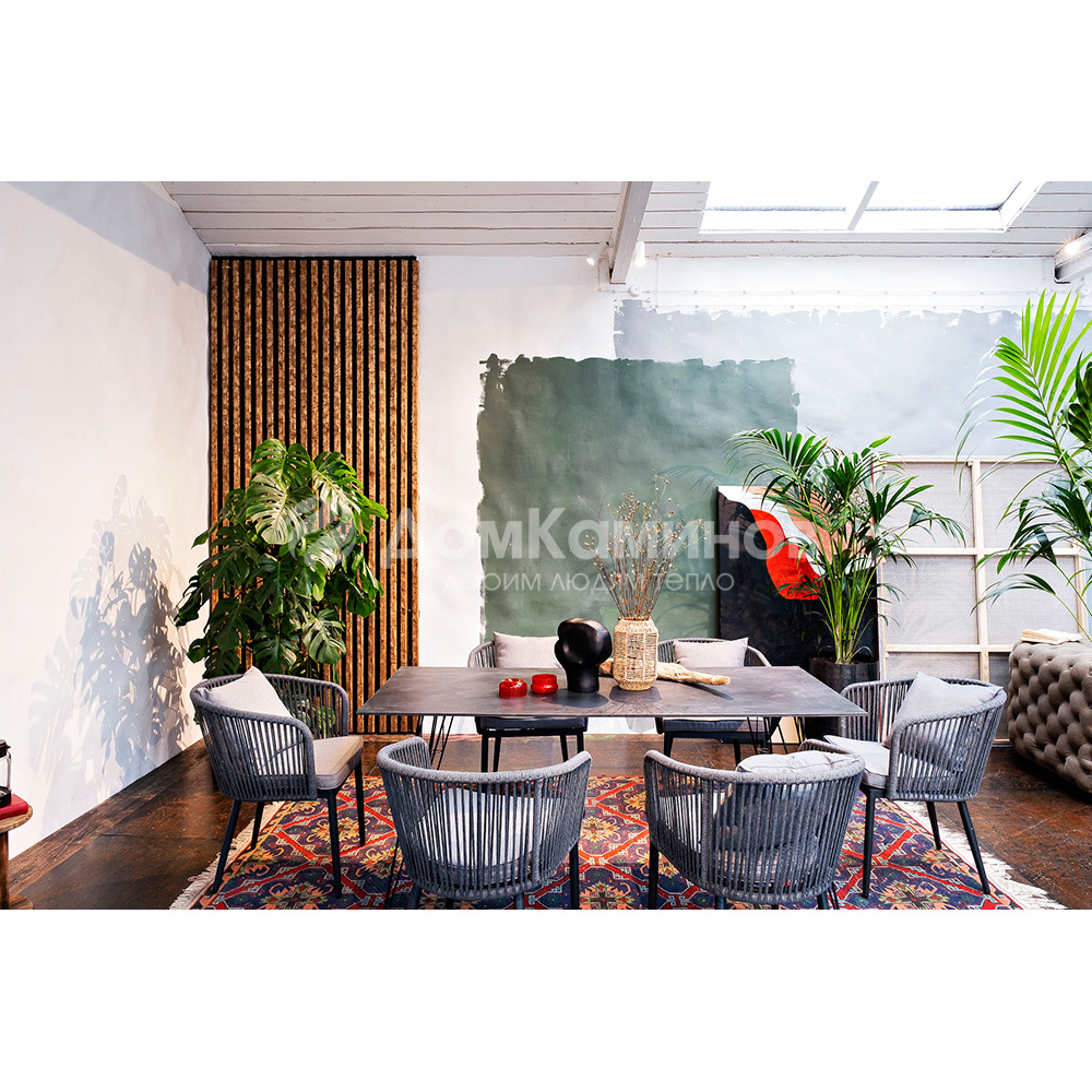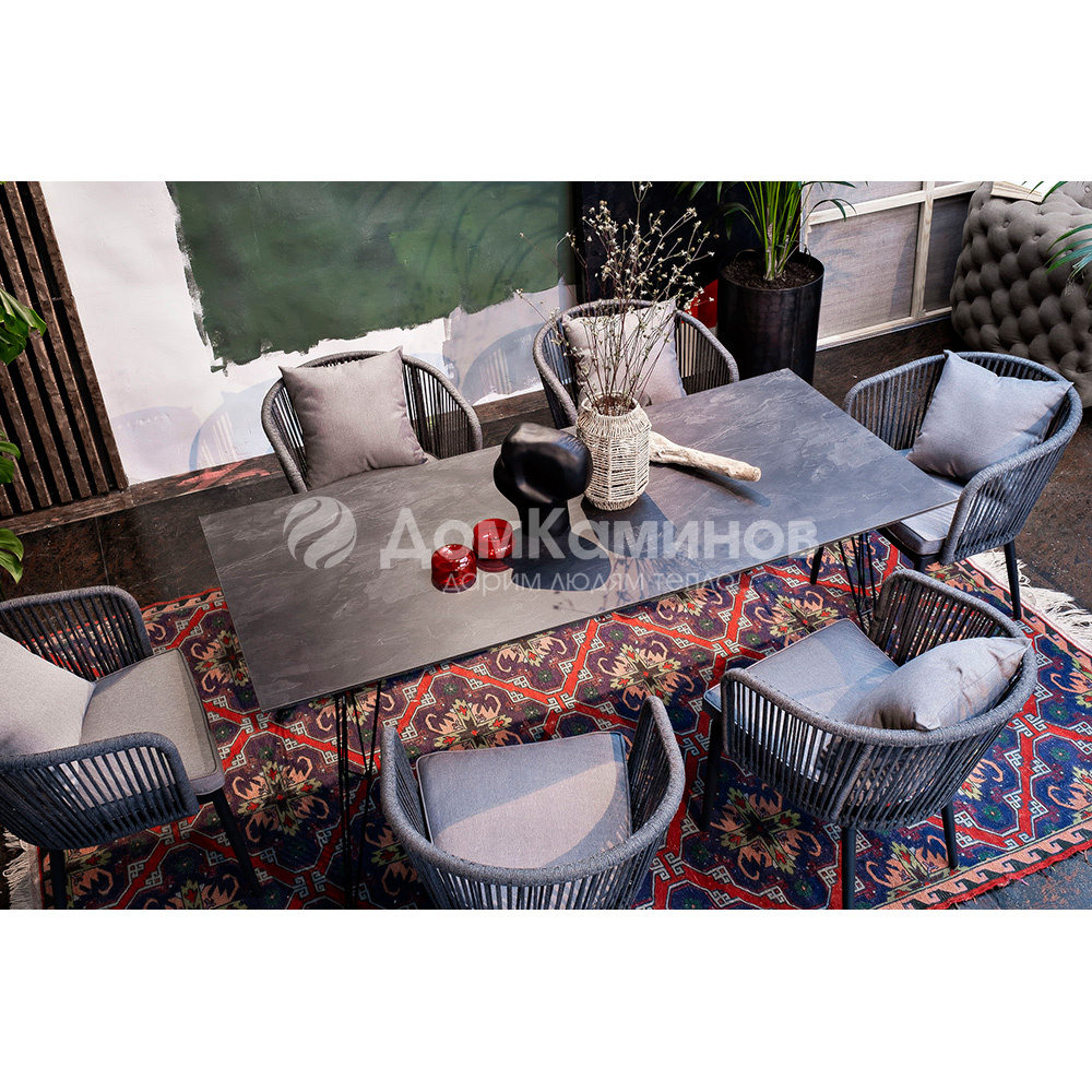 Обеденная группа состоит из одного стола со столешницей HPL цвета серый гранит, размер 180х80 см. металлическое подстолье) и шести кресел из алюминиевого каркаса, оплетенного вручную эластичными синтетическими лентами из высокопрочных полиэфирных волокон, в комплекте с подушкой, цвет темно-серый.