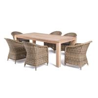 Обеденная группа на 8 персон. В комплект обеденной группы входит один обеденный стол, шесть стульев и подушки.Стол изготовлен из тикового дерева. Все стулья с подлокотниками и подушками, алюминиевый каркас, круглый искусственный ротанг соломенного цвета.